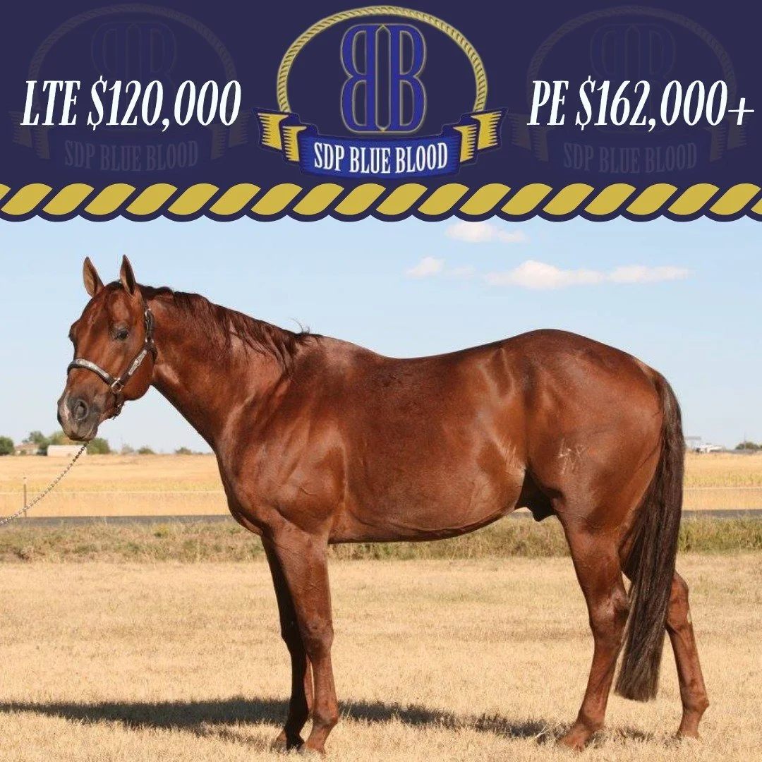 SDP Blue Blood was sired by Laredo Blue (LTE of $302,000) and 2003 NCHA Horse of the Year. Laredo Blue offspring have earned more than $600,000. SDP Blue Blood’s dam was SDP I Got Good Genes, with lifetime earnings of $66,000, who is a full sister to TR Dual Rey (LTE $353,000). She has produced offspring that have earned over $328,000.