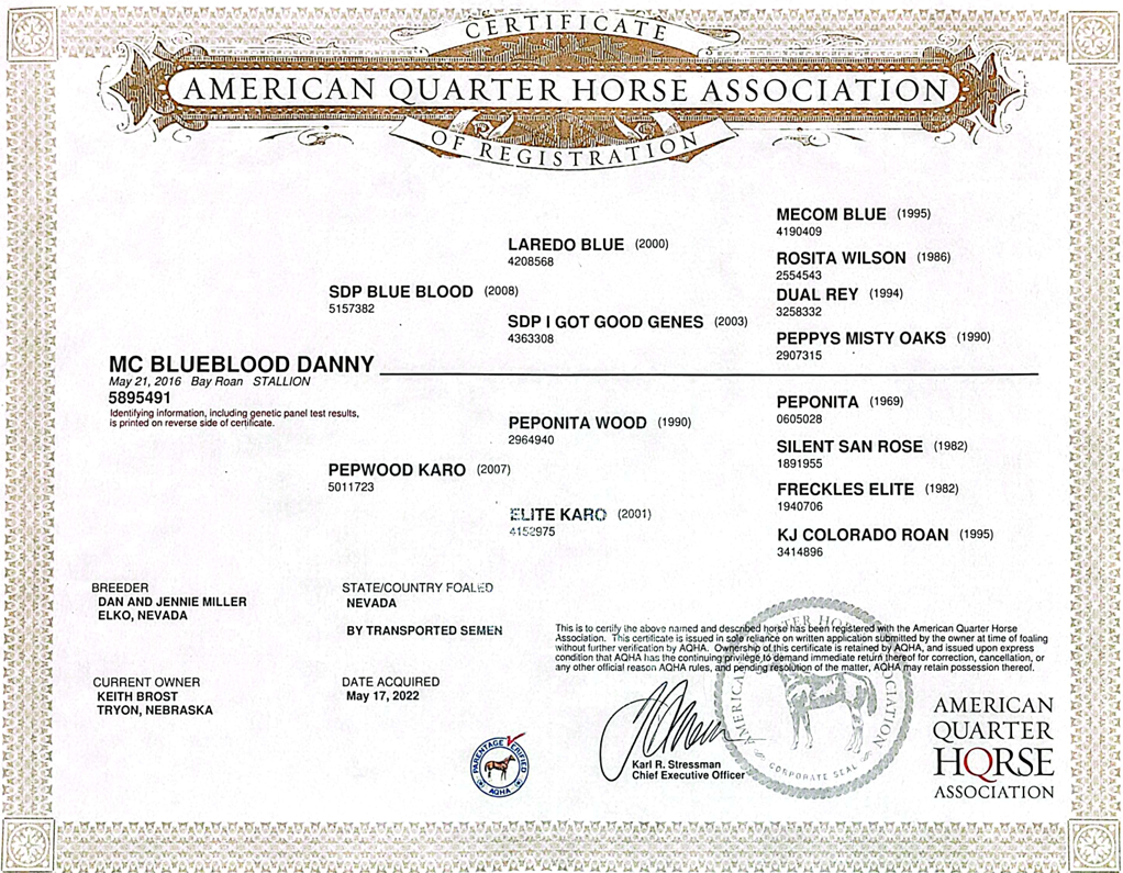 MC Blueblood Danny’s dam is a mare sired by Freckles Elite with Lucky Bottom Pal as the maternal grand sire.