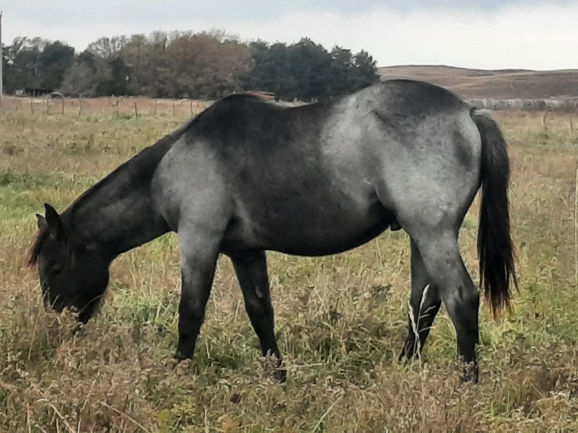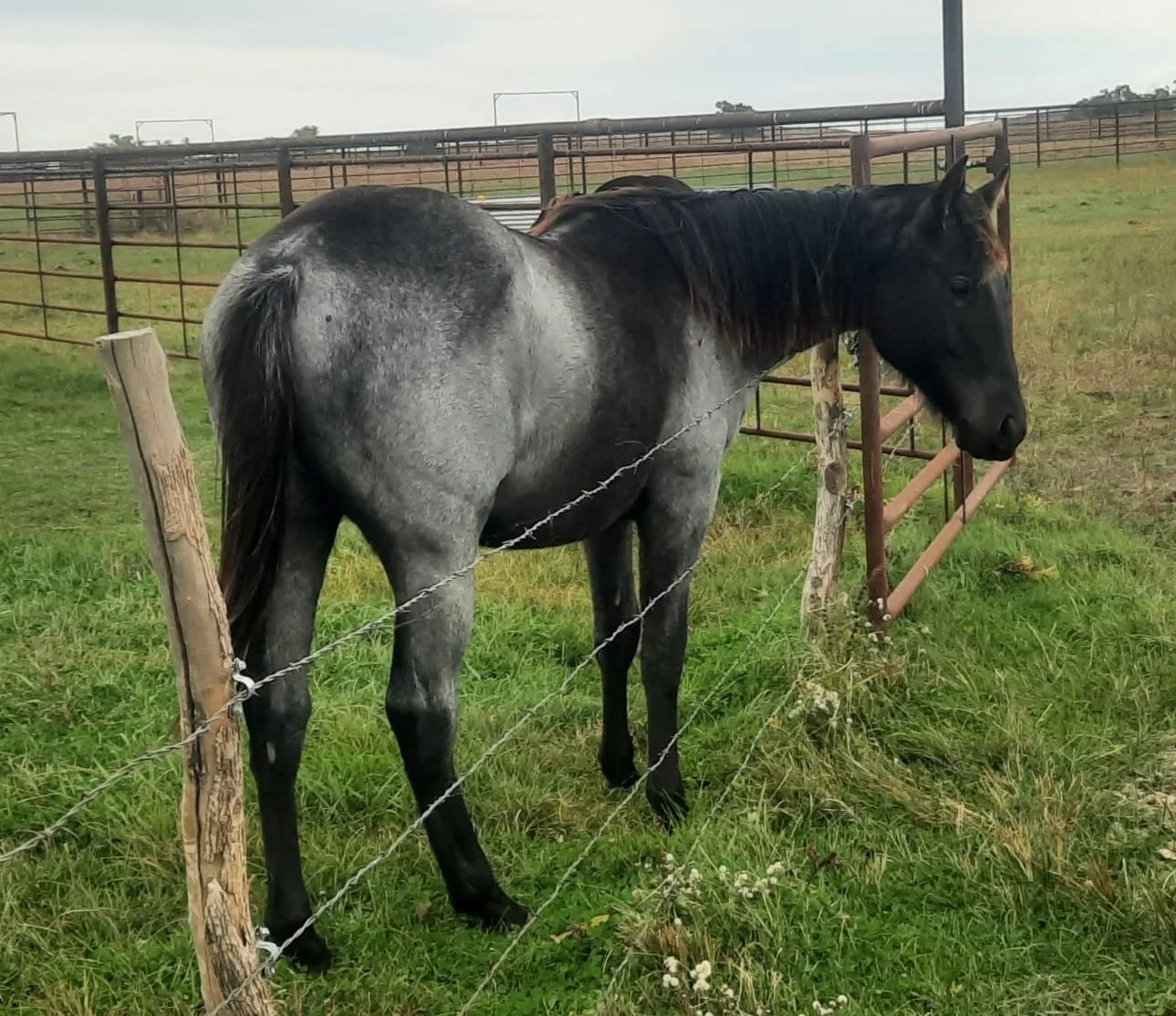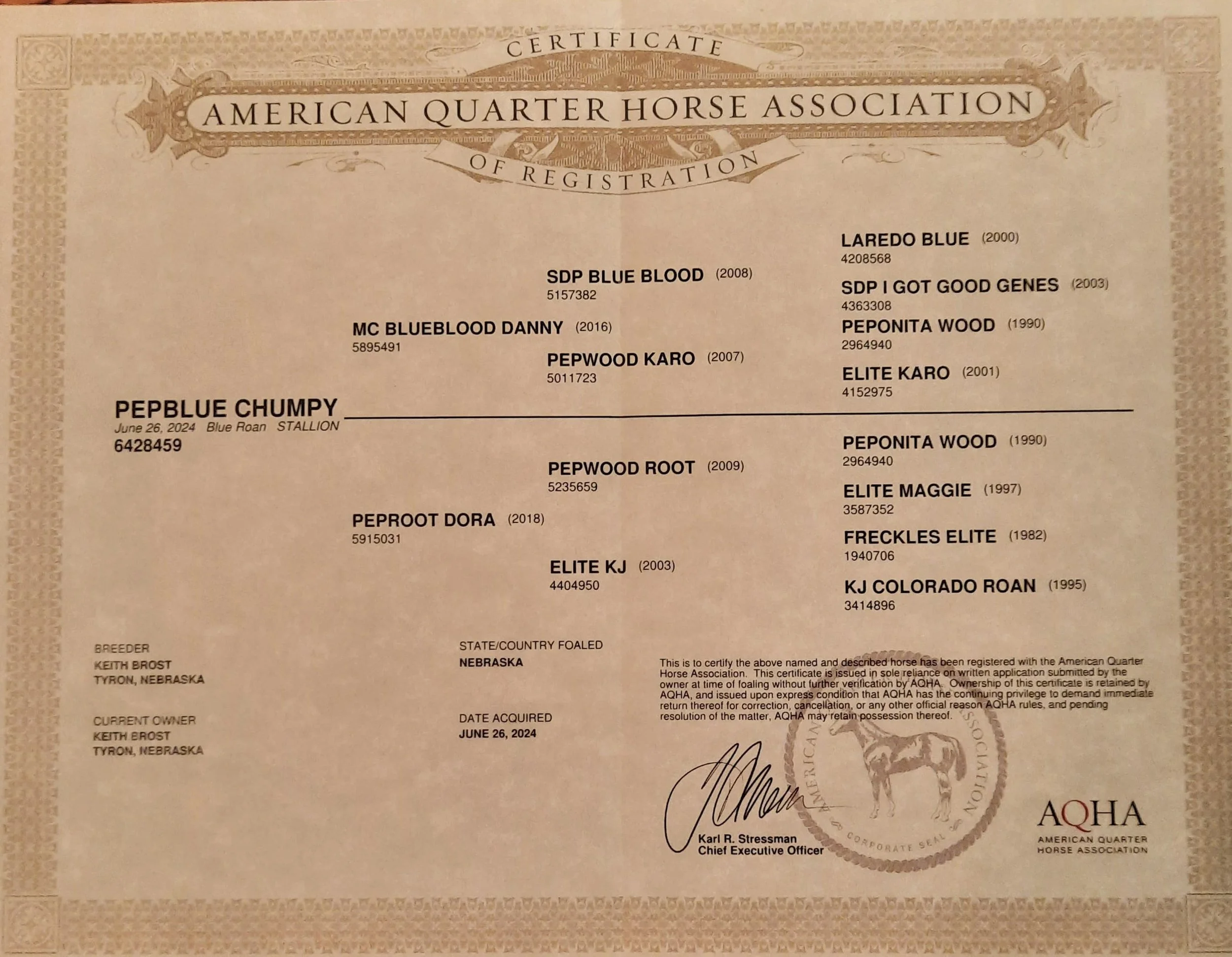 Pepblue Chumpy is a 2024 blue roan yearling stud colt. He has Colonel Freckles x Peponita on both sides of his pedigree, with a cross to SDP Blue Blood on the top side. Chumpy is thick, well built and also very gentle! He was very easy to halter break and great to work with.