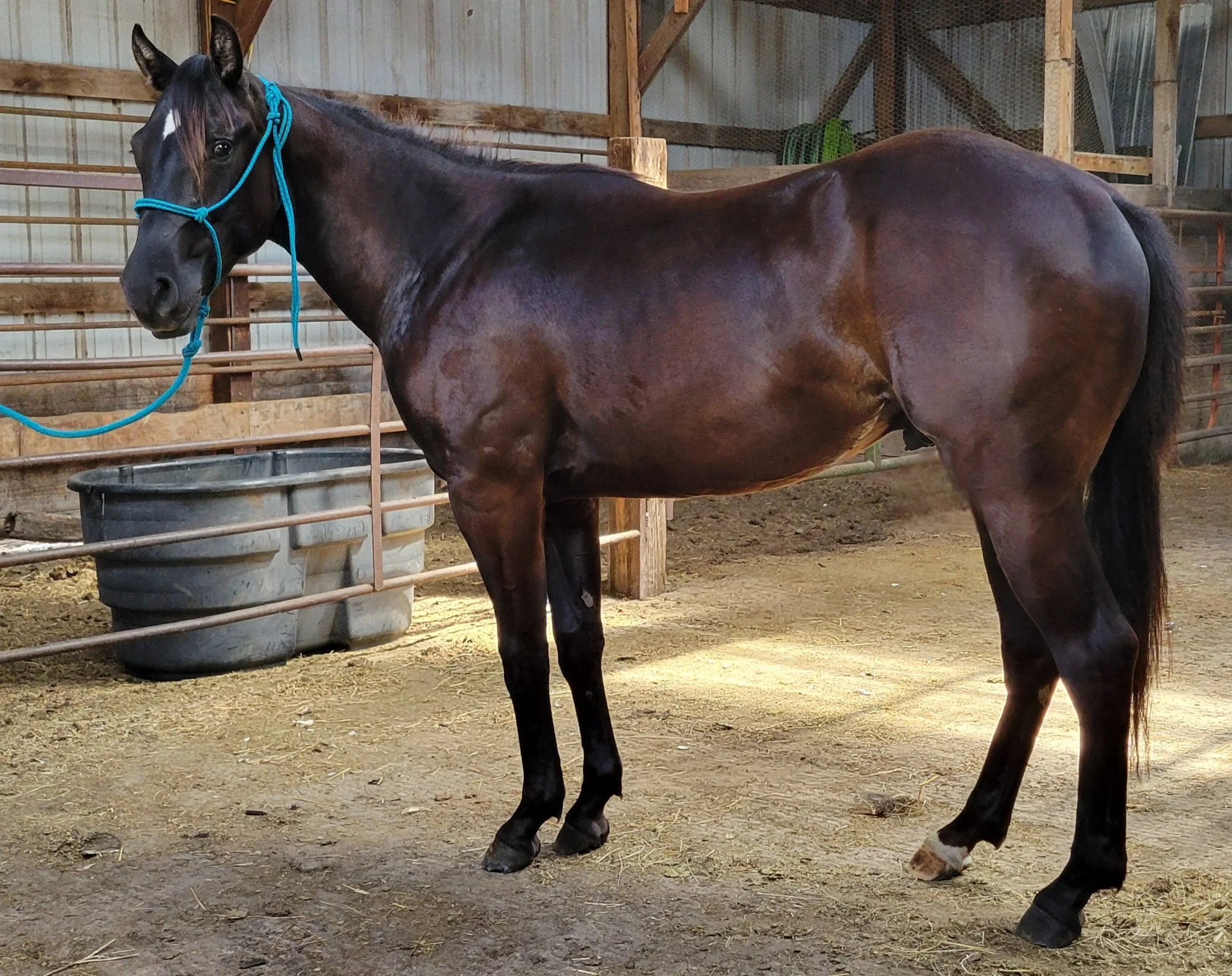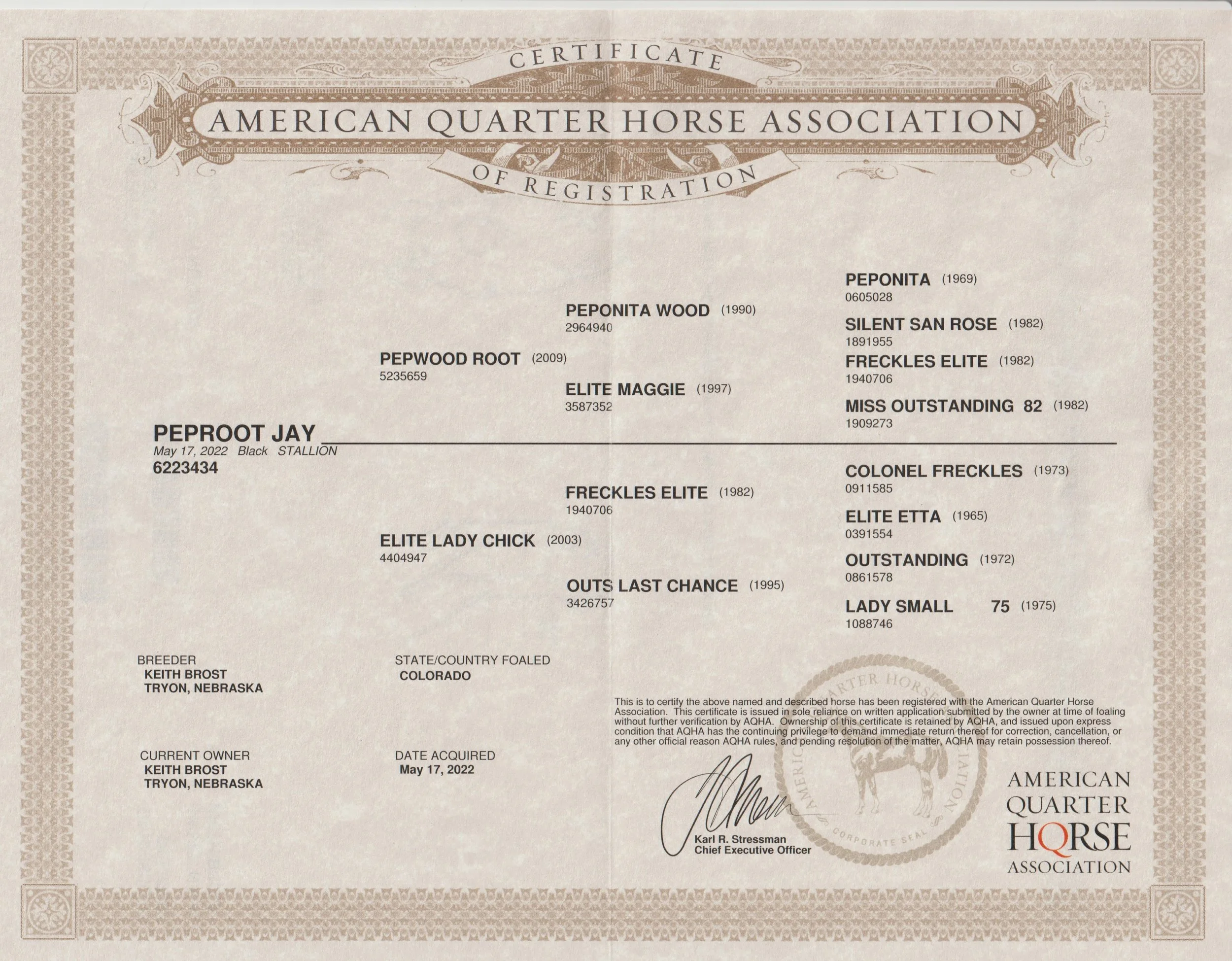 Peproot Jay is a 2022 black gelding with the King Ranch foundation x Colonel Freckles x Peponita breeding. He has a quiet, calm disposition but is also very attentive and willing. He is halter broke and has been brought in and worked with several times. This gelding is going to be tall, stout and flashy! Short video of Peproot Jay is shown below (scroll down).