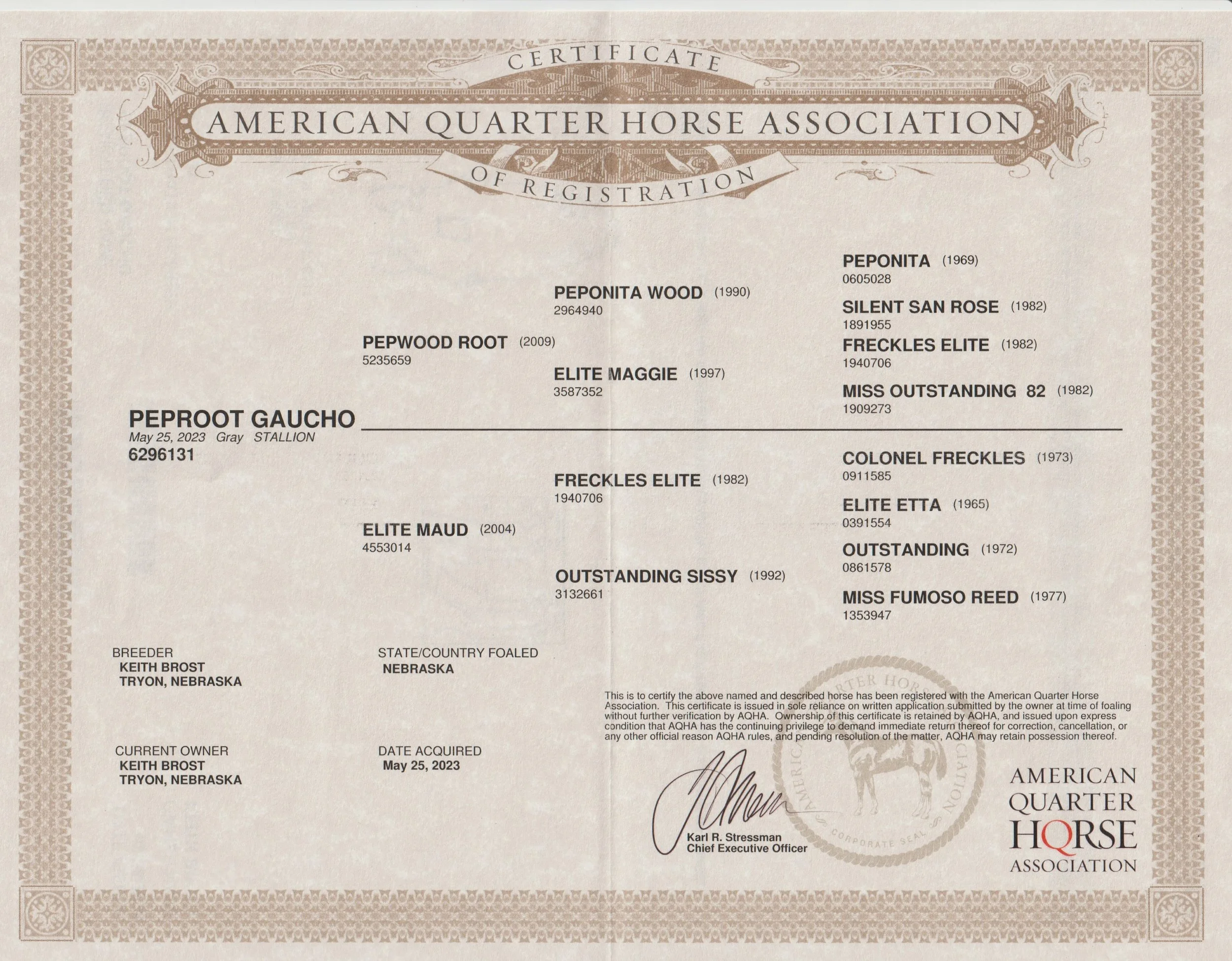 Peproot Gaucho is a 2023 gray stud colt. He is another stout, big colt with the King Ranch foundation x Colonel Freckles x Peponita breeding. He is halter broke and has been brought in and worked several times, he has been fantastic. He will make an excellent gelding to rope on and perform cattle work.