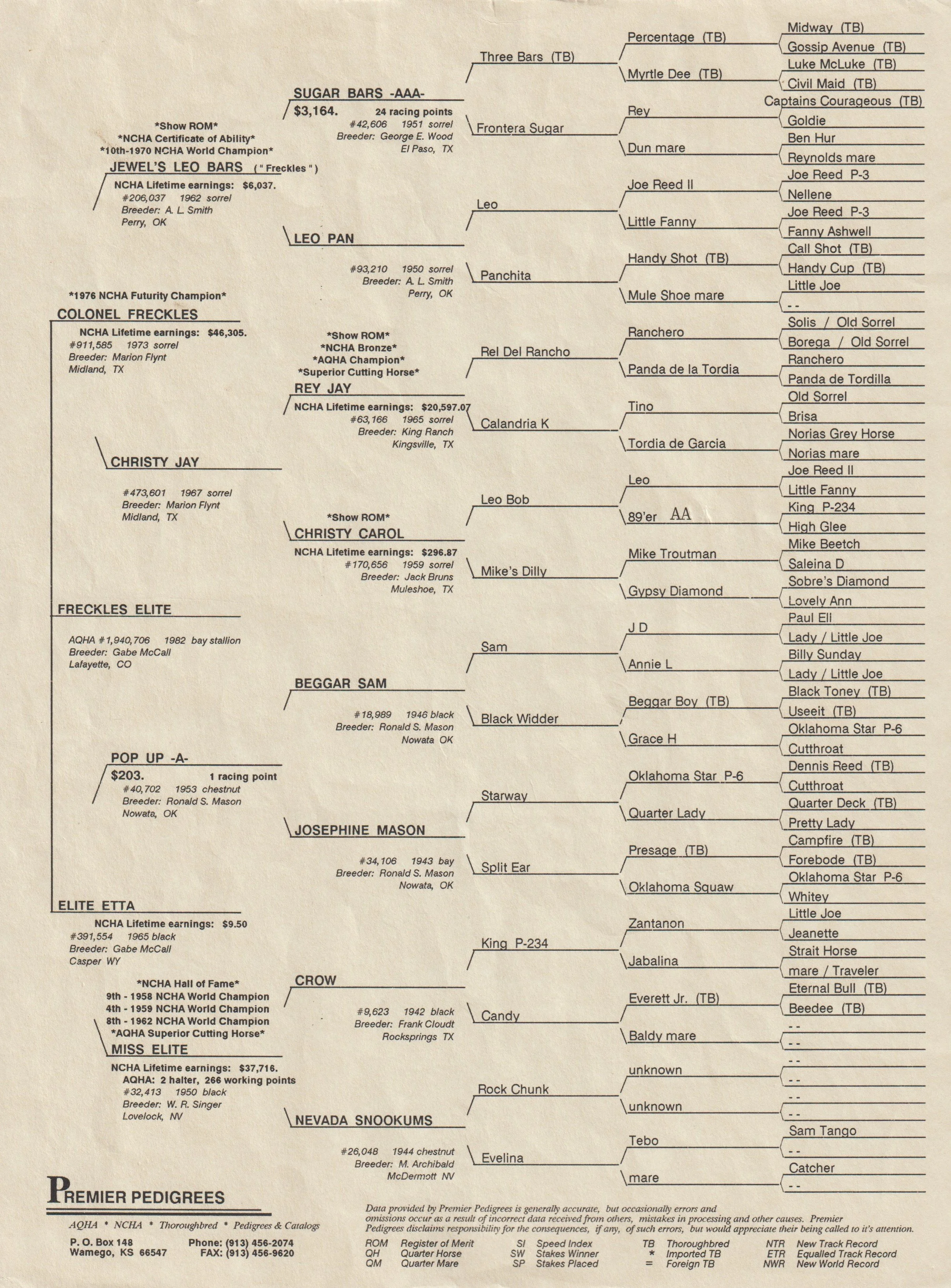 Freckles Elite was sired by Colonel Freckles, a NCHA futurity champion, an all-time leading cutting sire, a leading reined cowhorse sire and an NRHA all-time leading cutting maternal grandsire, siring the earners of over $4 million. His earnings as a grandsire tally to more than $11 million spanning multiple disciplines in the Western performance industry. Colonel Freckles is also an Equi-Stat top 20 all-time leading cutting maternal grandsire, 2001 Equi-Stat top 10 leading reining maternal grandsire and a leading reined cowhorse maternal grandsire. Colonel Freckles was inducted into the AQHA Hall of Fame in 2004.
